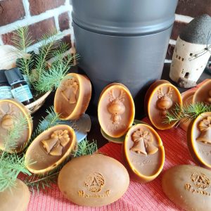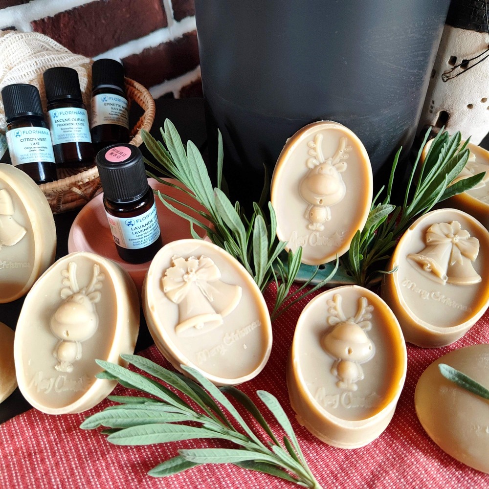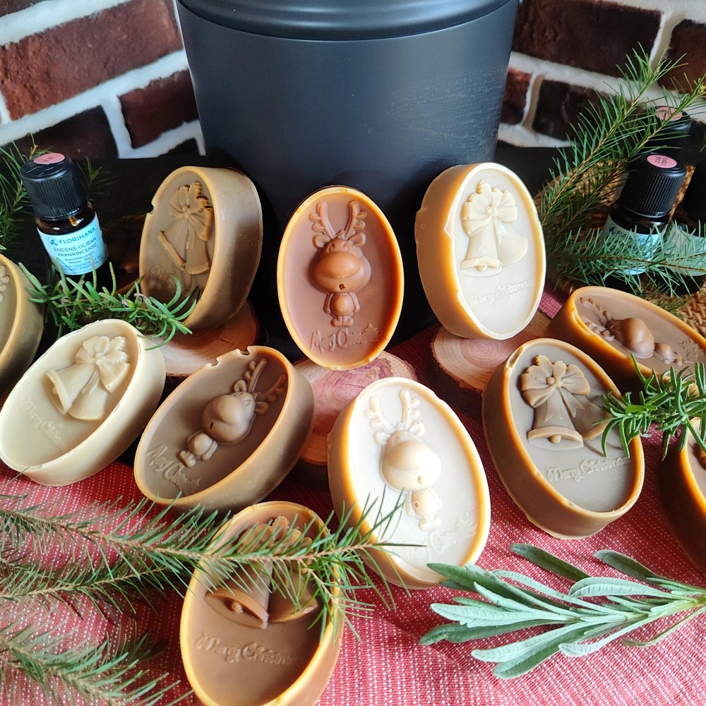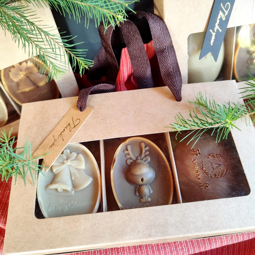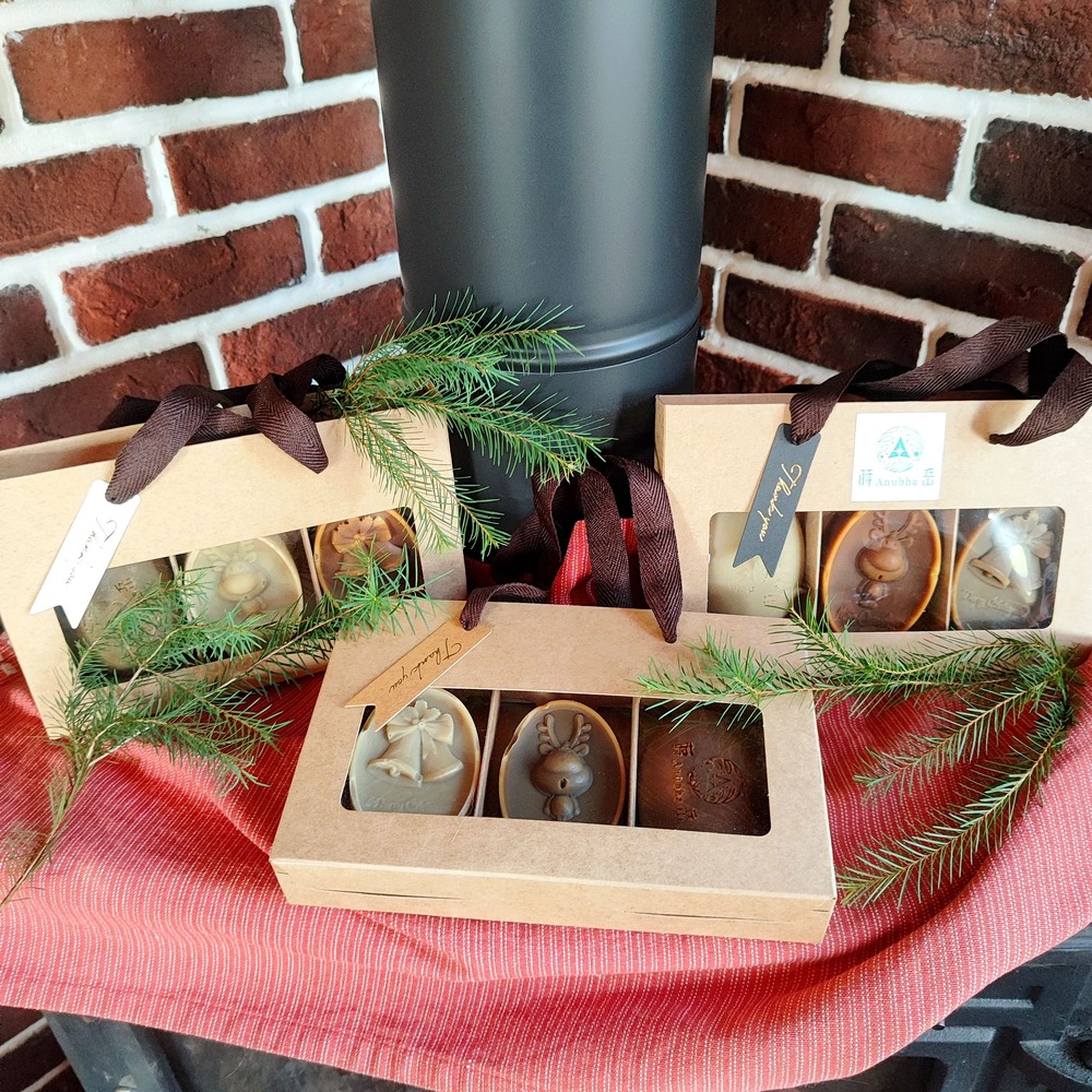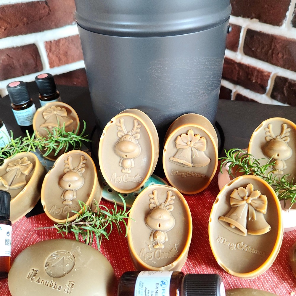 特別為聖誕送禮或節慶氣氛所製作的麋鹿、鈴鐺造型的香藥草手工皂。分別以澳洲茶樹、甜薰衣草、迷迭香,三種農園鮮採的無毒香草熬煮2~3小時濃縮萃取的香草茶湯作為百分之百的水相,全程手工製作的冷製皂,能感受到大自然深深的療癒,並舒緩身心、放鬆壓力。
